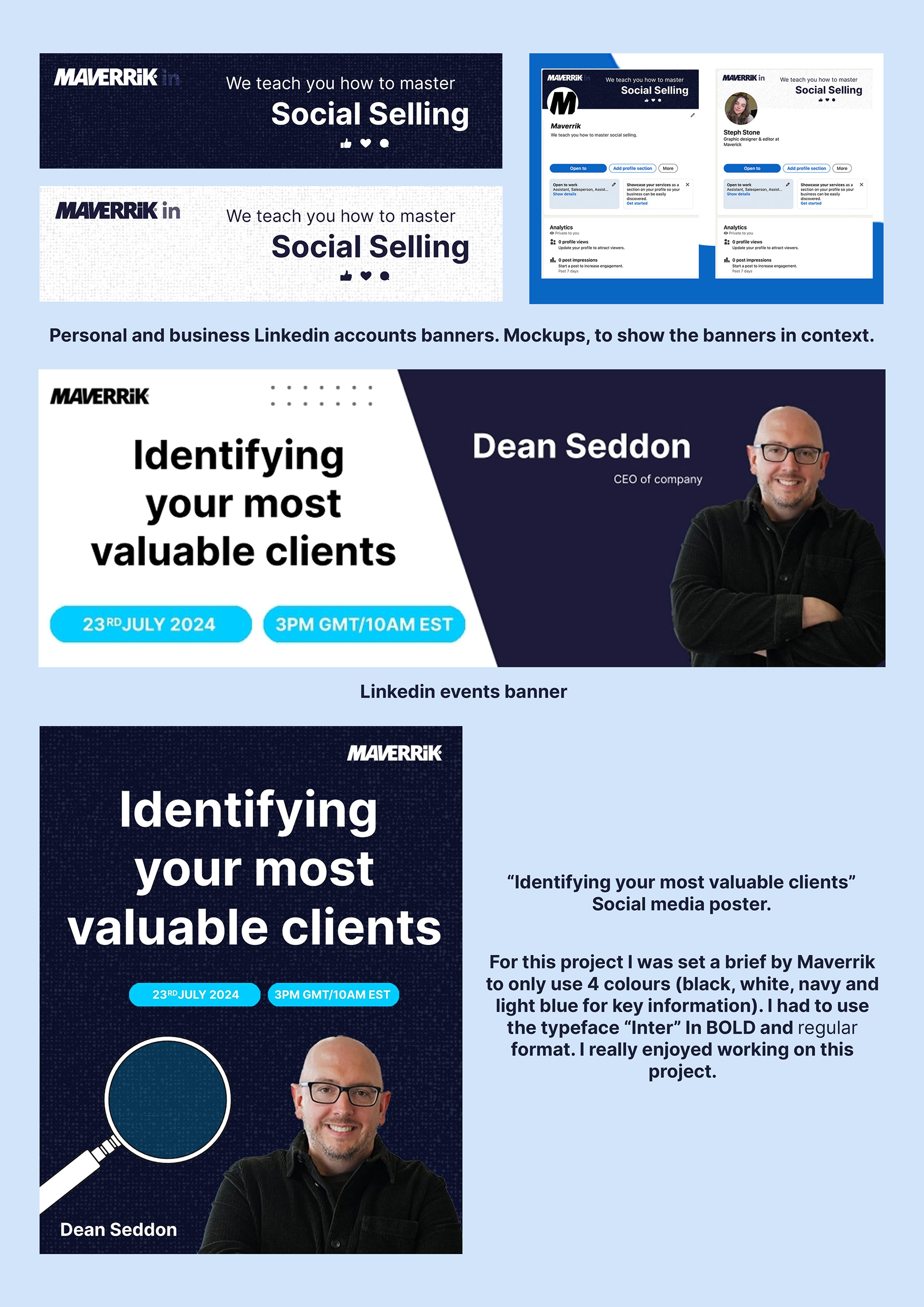 It was an exciting to have the opportunity to work with Maverrik. I've created a personal, company banner for LinkedIn, Webinar header and a social media post.